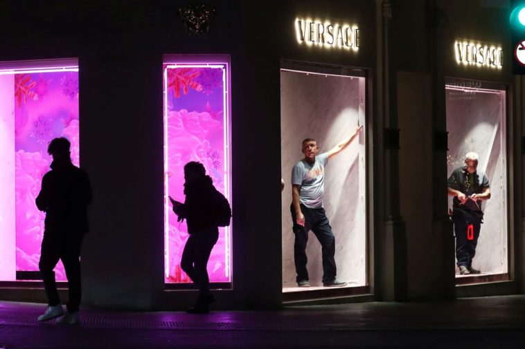 People prepare a window display of a Versace store on new Bond Street in London on Nov. 30, 2020.