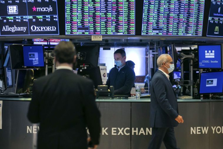 In this photo provided by the New York Stock Exchange, specialist Stephen Naughton, center, works at his post on the trading floor, on Dec. 4, 2020.