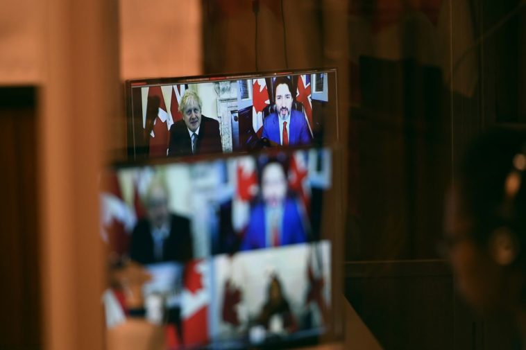 Canadian Prime Minister Justin Trudeau and UK Prime Minister Boris Johnson are seen in a pre-recorded video during a news conference in Ottawa on Nov. 21, 2020.