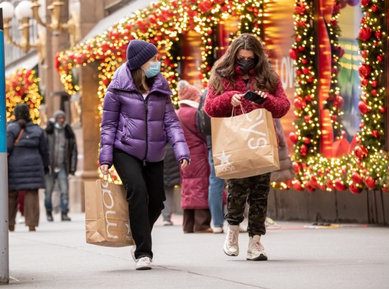 NEW YORK, NEW YORK – DECEMBER 02: People carry shopping bags by holiday decorations outside of … [+]