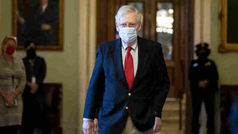 Senate Majority Leader Mitch McConnell, R-Ky., arrives to the U.S. Capitol on Friday when lawmakers faced a midnight deadline to pass a bill to fund the government.