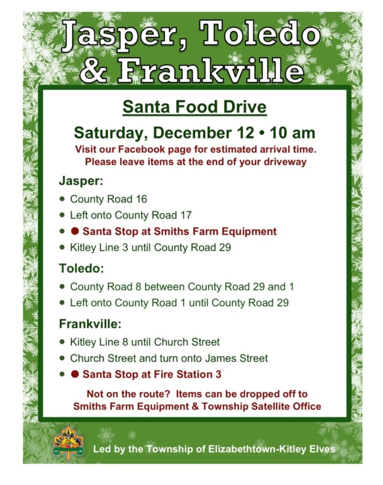The food drive will start at 10 a.m. and items collected will go to food banks in Brockville, Athens and Smiths Falls.