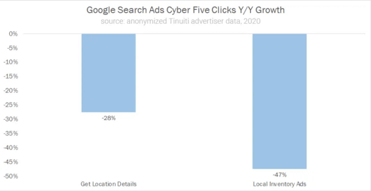 Looking at the omnichannel impact for paid search ads, Taylor said, Google Local Inventory Ads clicks were down 47% year-over-year, “so while there was certainly an increase in curbside pickup, it didn’t make up for the overall dip in brick-and-mortar interest from consumers. We also saw a big drop in ‘Get location details’ clicks.”