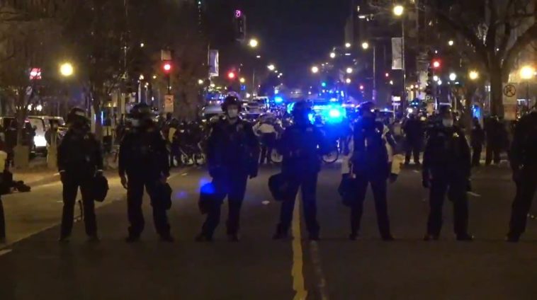 At least one police officer was injured in the clashes, according to Washington’s WJLA-TV, which tweeted video of the officer being helped away by colleagues.