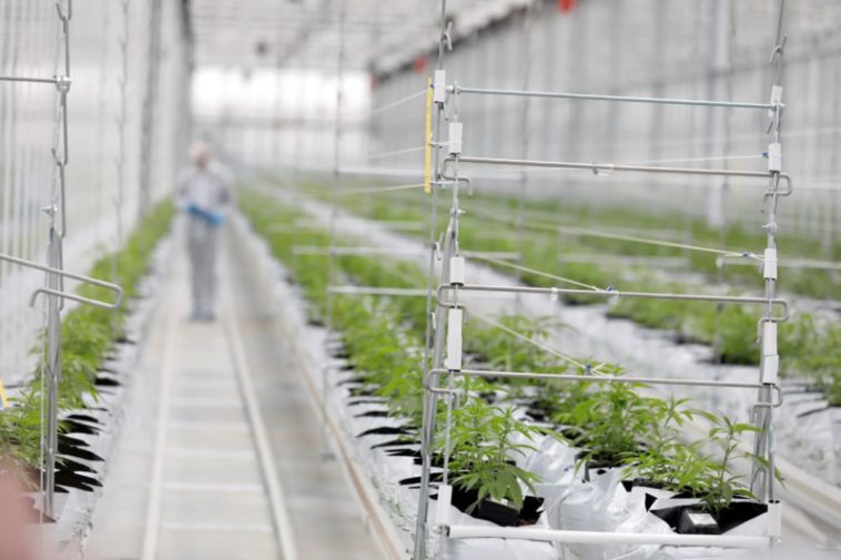 A worker checks cannabis plants inside a Tilray facility in Cantanhede, Portugal, on April 24, 2019.