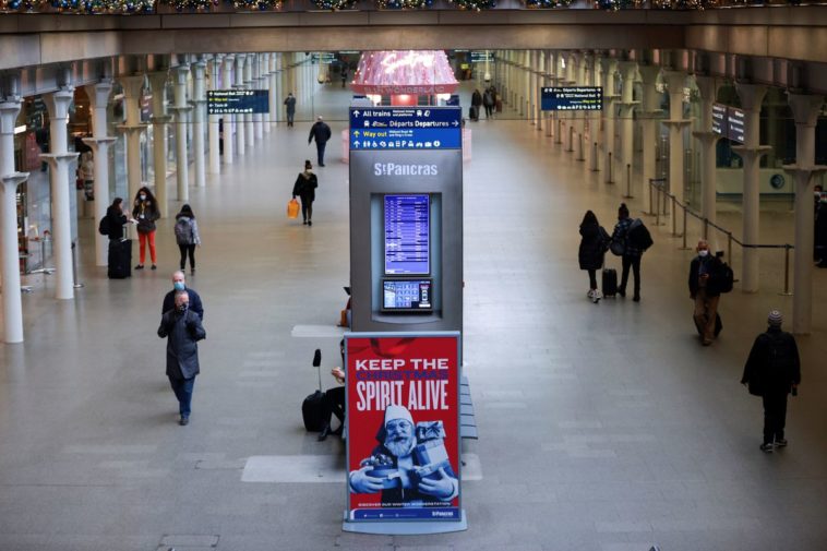 Travellers walk through St. Pancras International, as EU countries impose a travel ban from the U.K. following a COVID-19 variant outbreak, in London, Britain, on Dec. 21, 2020.