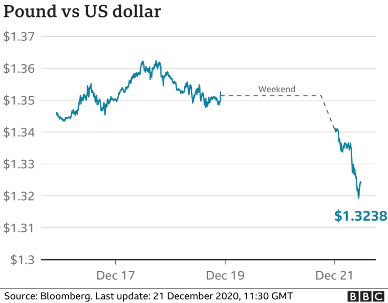 Shares in London have fallen sharply and the pound has lost ground after several EU countries closed their borders to the UK, which has reported a new variant of coronavirus.