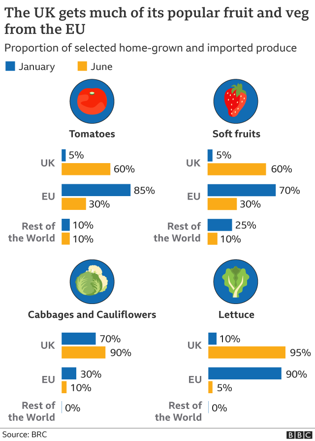 Britain imports nearly half of its fresh vegetables and the majority of its fruit, both mainly from the EU.