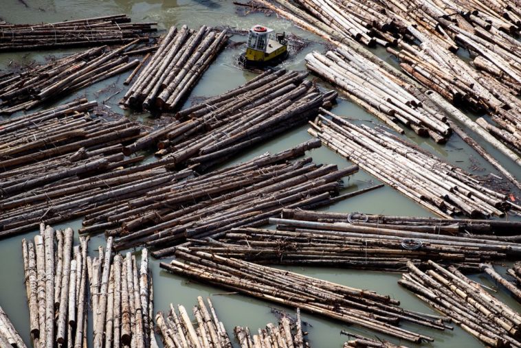 A worker uses a small boat to move logs on the Fraser River at the Delta Cedar Products mill in Delta, B.C., on Aug. 24, 2020.