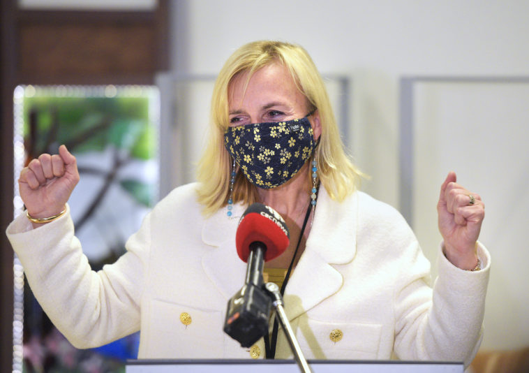 Dr. Heather Morrison cheers during a press conference following the first COVID-19 vaccinations in Prince Edward Island on Dec. 16.