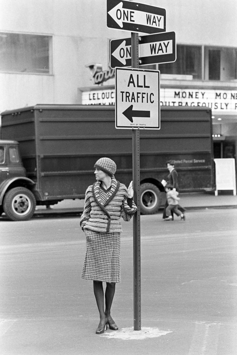 A model poses near the Paris Theater on 58th Street in a look from Missoni’s fall 1973 ready-to-wear collection in New York City.