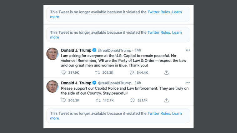 Mr Trump’s account now states that three of his tweets are “no longer available because [they] violated” its rules.