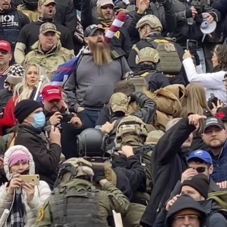 A close examination of the group marching up the steps to help breach the Capitol shows they wore military-style patches that read “MILITIA” and “OATHKEEPER.” Others were wearing patches and insignias representing far-right militant groups, including the Proud Boys, the Three Percenters and various self-styled state militias.
