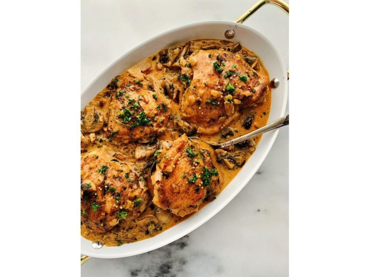 Chicken thighs are full of flavour, especially when they are seared in bacon fat. A rich and creamy mushroom sauce is made in that same skillet, with all of those browned bits scraped up for mega flavour. The chicken returns to the pan, along with chopped bacon, and it hangs out in the oven for 30 minutes, leaving you time to cook potatoes or pasta because this sauce needs something carby to sink into.