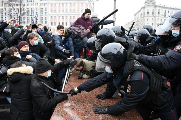 In Moscow on Saturday, riot police officers wearing black helmets and swinging batons began grabbing people in Pushkin Square, in the center of the Russian capital, even before the start of a planned protest. They did the same in the summer of 2019 during the last round of protests called by Aleksei A. Navalny, Russia’s most prominent and now again jailed opposition leader.
