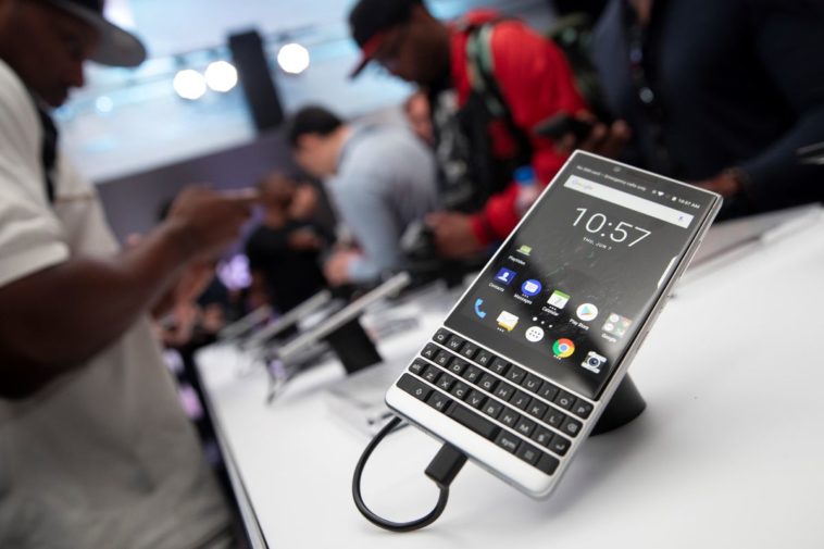 The new BlackBerry Key2 smartphone is displayed at a product launch event for the device in Manhattan in New York, June 7, 2018.