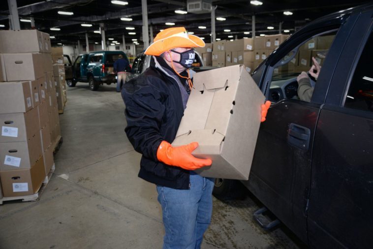 Each weekend, thousands of cars line up at sites much like the Eastern States Exposition distribution center and Melanson’s crews of volunteers swing 32-pound Patriot Farm Food boxes of fruit, vegetables, dairy products and meat into each car.