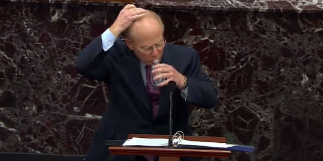 David Schoen, defense lawyer for former President Donald Trump drinks some water as he speaks on the first day of former President Donald Trump's second impeachment trial at the U.S. Capitol on February 9, 2021, in Washington, DC. (Photo by congress.gov via Getty Images)