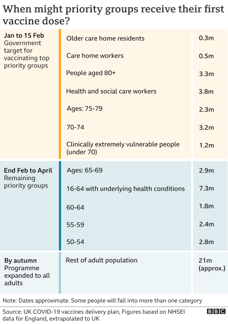 Included in the first four priority groups, which covers 88% of those most at risk of dying from Covid-19, are people aged 70 and over, frontline health and social care workers, care homes residents and those at very high risk of severe illness from coronavirus.