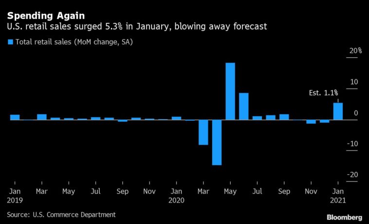 U.S. retail sales surged in January by the most in seven months, beating all estimates and suggesting fresh stimulus checks helped spur a rebound in household demand following a weak fourth quarter.