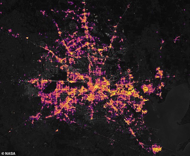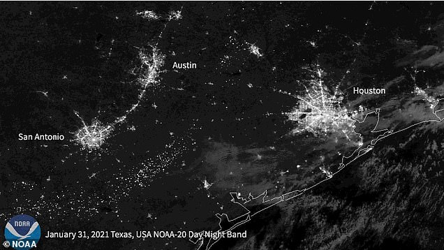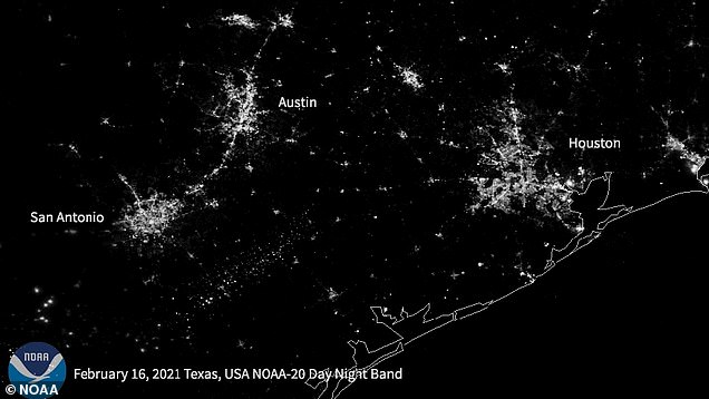 ERCOT operates the power grid that covers most of the state and was behind the decision to have rolling blackouts which left up to 4 million people enduring outages in subfreezing temperatures. Houston is pictured from space during the blackouts