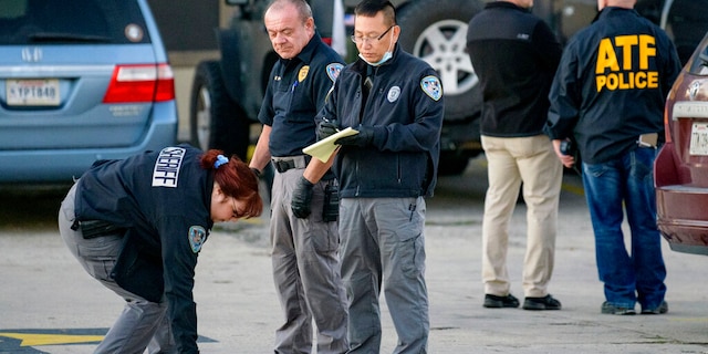 Jefferson Parish Sheriff’s Office and Bureau of Alcohol, Tobacco, Firearms and Explosives: ATF investigators look at evidence at the scene of a multiple fatality shooting at the Jefferson Gun Outlet in Metairie, La. Saturday, Feb. 20, 2021. A person went into a gun store and shooting range in a New Orleans suburb and fatally shot two people Saturday, causing customers and staff to open fire on the shooter, said a sheriff. The shooter also died. (AP Photo/Matthew Hinton)