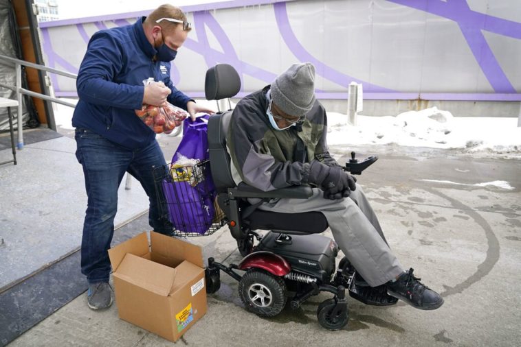 “It puts a smile on your face,” said Dave Lestina, 59, who lives off a small disability check. He counts on getting a food box from the distribution spot a few blocks from his small downtown apartment and notes that “it seems like some of it’s better than what you can buy at the supermarket.”