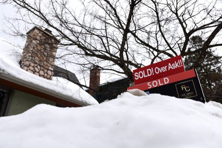 A for sale sign outside a home indicates that it has sold for over the asking price, in Ottawa, on March 1, 2021.