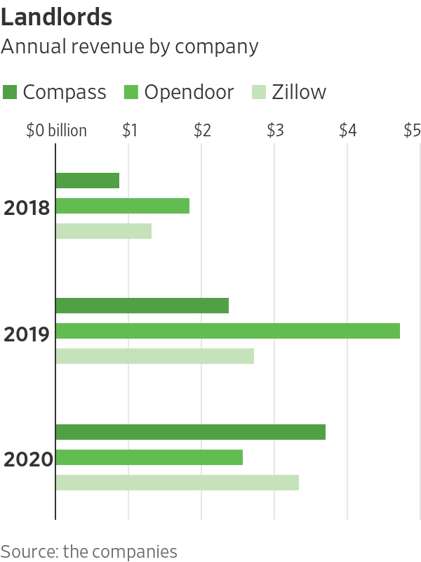 Since almost 90% of home buyers and sellers in the U.S. still work with agents, an agent-centric approach is sensible. Taking advantage of the massive increase in real-estate transactions last year, Compass, which generates most its revenue from commissions, grew revenue 56% last year. Opendoor, by comparison, said revenue fell 46% last year on the same basis as iBuyers’ automated home-flipping businesses temporarily shut down due to the coronavirus pandemic.