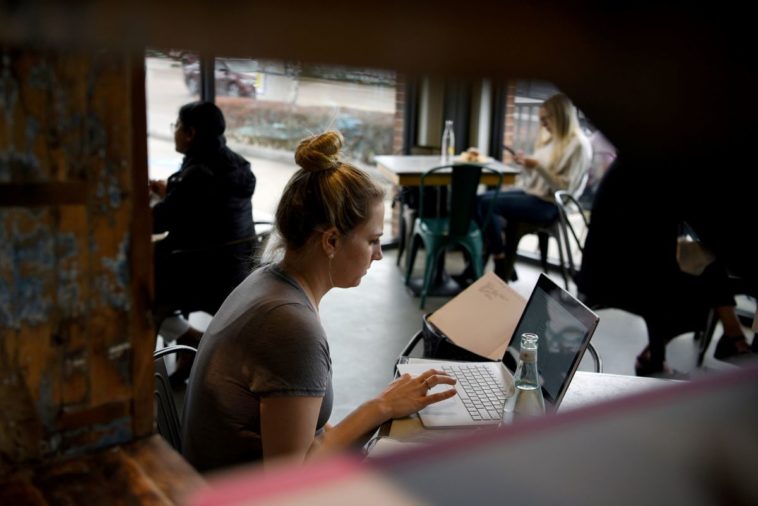 Kathryn Boeker works at a coffee shop as the state of Texas lifts its mask mandate and allows businesses to reopen at full capacity in Houston on March 10, 2021.