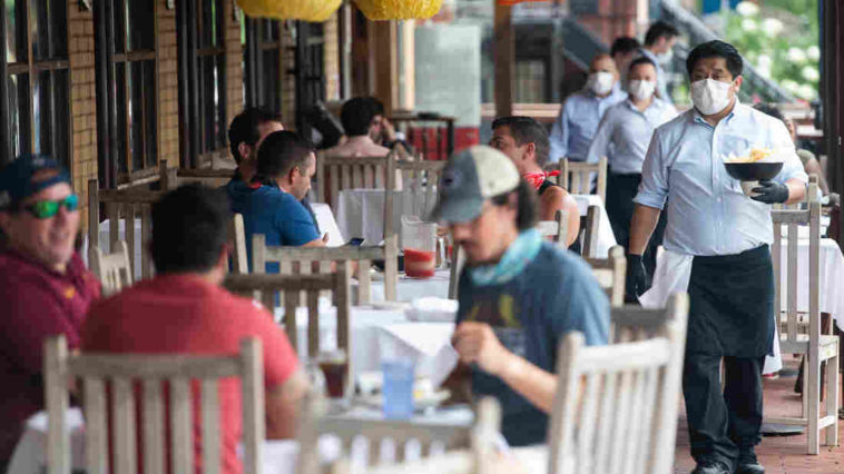 A waiter wearing a mask and gloves delivers food to a table to customers seated at an outdoor patio at a restaurant in Washington, D.C. in May.