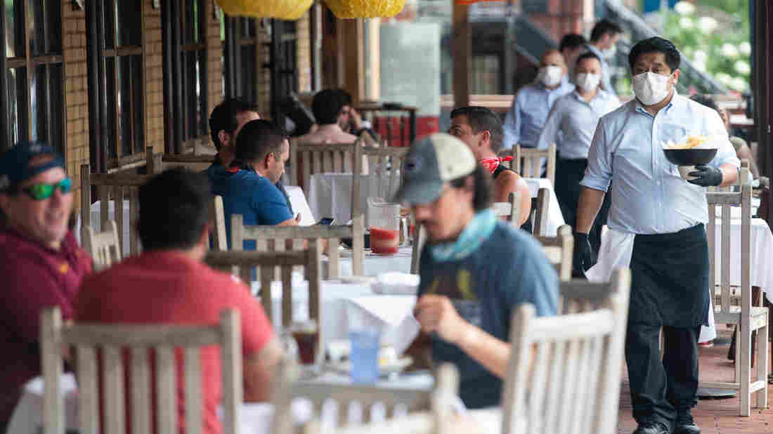 A waiter wearing a mask and gloves delivers food to a table to customers seated at an outdoor patio at a restaurant in Washington, D.C. in May.