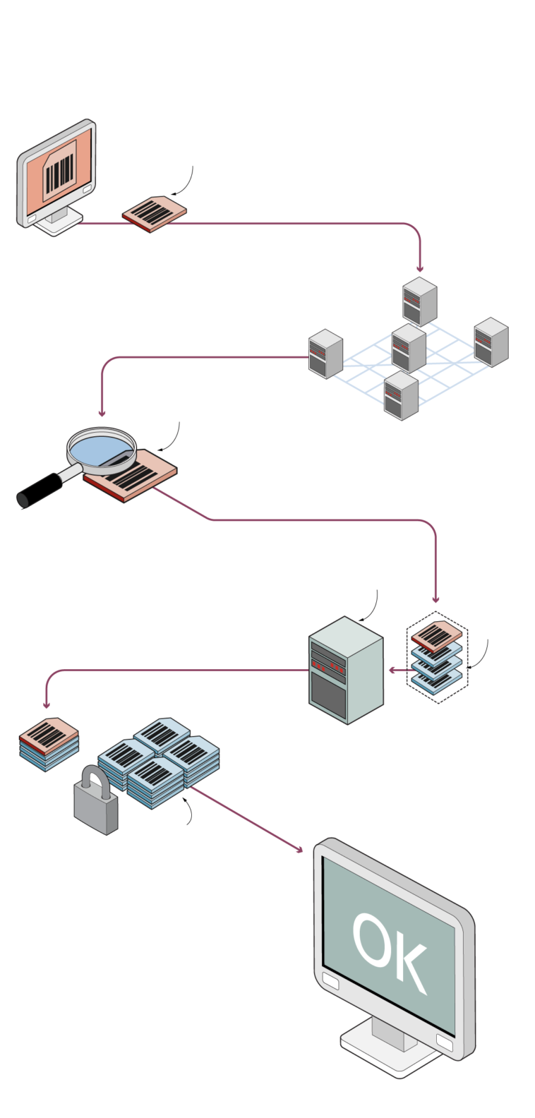 The request is sent to a peer-to-peer network made up of computers, which are called nodes