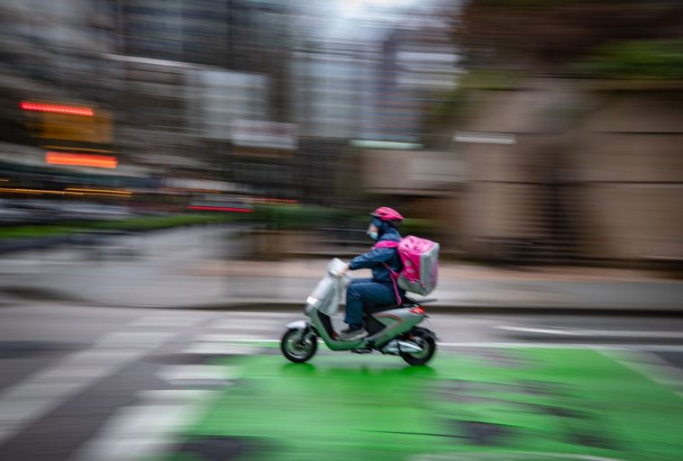 A food delivery worker rides an electric bike in downtown Vancouver, on Jan. 12, 2021.