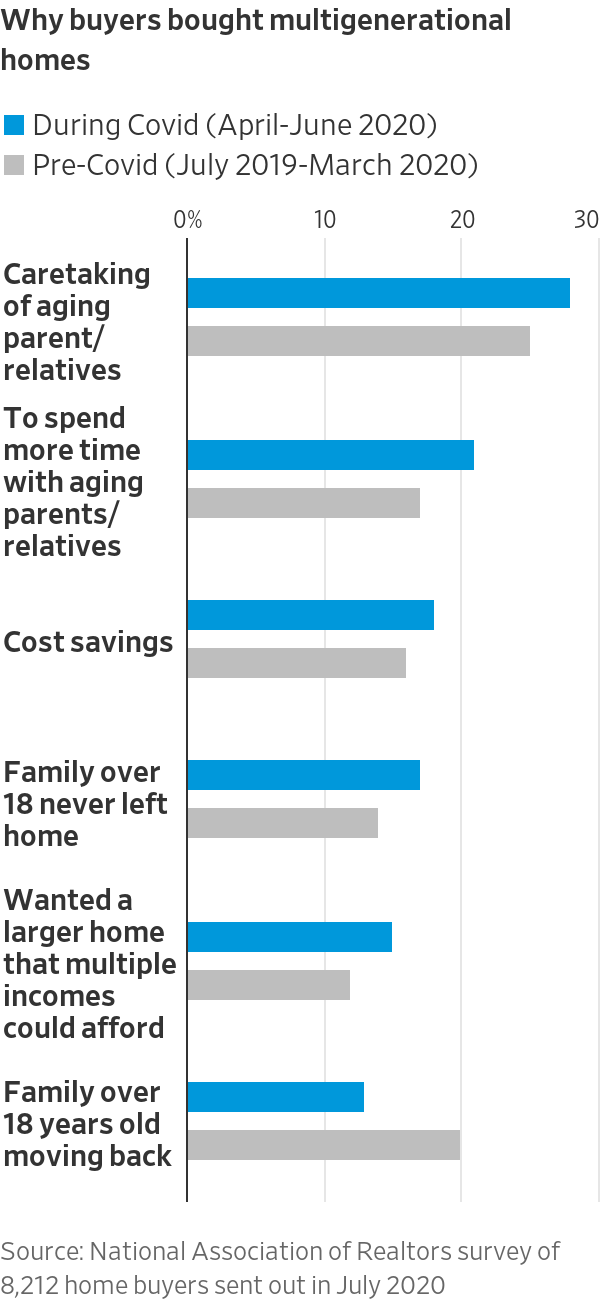 Parents and children, siblings and grandparents are shacking up during the pandemic, opting for living in close quarters over quarantining from each other. Some 15% of people who bought homes between April and June of last year planned to have multiple generations living there, according to a survey by the National Association of Realtors. That is up from 11% of those who bought between July 2019 and March 2020, and the highest level in survey data going back to mid-2012.