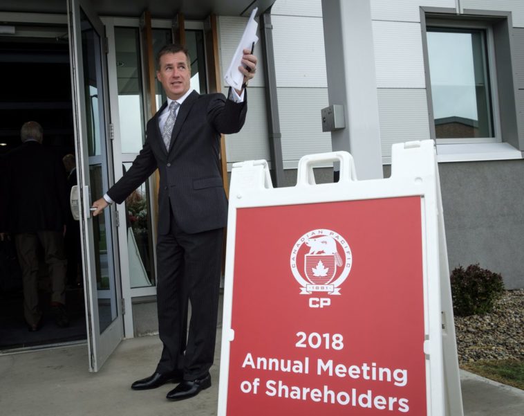CP Rail president and CEO Keith Creel holds the door for shareholders at the company’s annual meeting in Calgary on May 10, 2018.