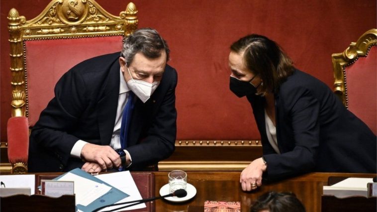 Italian Prime Minister Mario Draghi (L) with Minister of Interior Luciana Lamorgese (R) after he delivered a speech at the Senate ahead of the upcoming European Council meeting, Rome, Italy, 24 March 2021