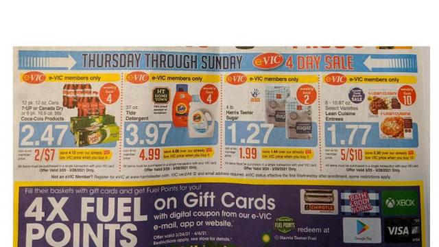 These deals are valid for e-Vic members from Thursday, March 25 – Sunday, March 28, 2021. You can sign up for the free e-Vic program on the Harris Teeter website using your VIC card.