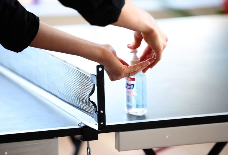 An employee with tech startup company Fast uses hand sanitizer after playing a game of ping pong in the office in San Francisco, California, on March 24, 2021.