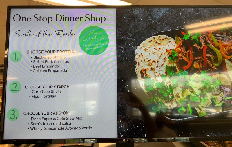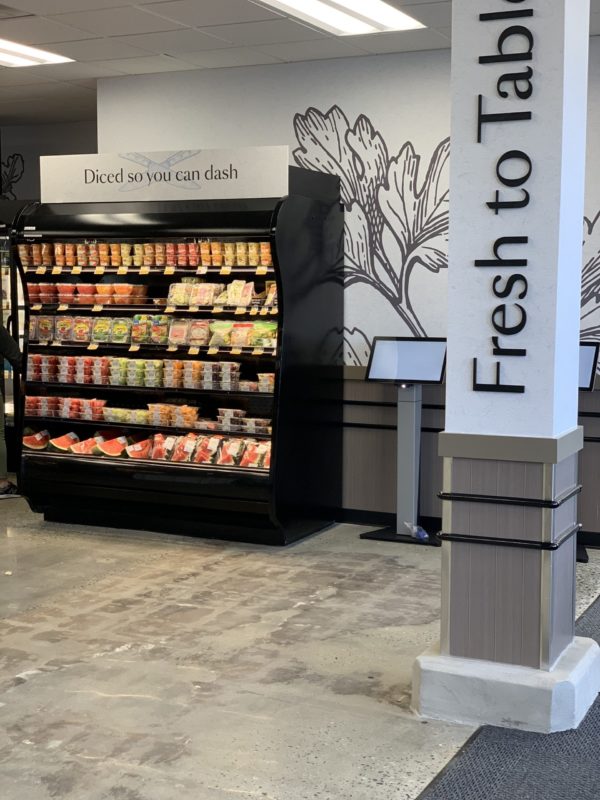 Numerous wide screens and clear signage help you navigate the selection of prepped and prepared foods. Don’t like to cook, or don’t have time tonight? The “One Stop Dinner Shop” display case is front and center. There are all the components required to put more than 5 complete meals on the table with ease. Think chicken tostada with fried leeks, 3 types of lasagna, plant packed veggie bowl, meatballs, caesar salad kit. (No need to walk through the entire store anymore!) There are both fully cooked and just prepped and portioned options. Menus will change often and are conceived by in-house chefs with time and convenience in mind. In case you need help deciding, a screen above displays beautiful food photos of the week’s menu, a QR code with the recipe, and prices for four servings.