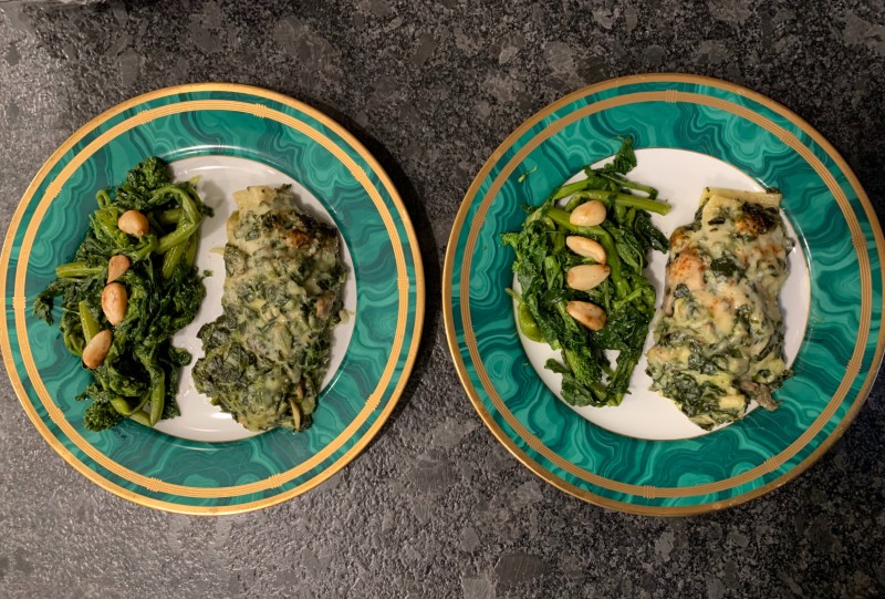 I love to cook, but like to take a break on Friday nights. The heat and eat section offered a bounty of gourmet delicacies in generous single portions. We selected single servings of spinach and mushroom lasagna, eggplant rollatini, garlic sautéed broccoli rabe. We settled on the lasagna and broccoli rabe, quickly plated and reheated for two, which was decidedly restaurant quality. Seasoned perfectly, fresh pasta is indulgently layered in a rich spinach and mushroom bechamel, the roasted garlic broccoli rabe a nice counterpoint in its simplicity. We topped off the meal with a fresh light cannoli – or two. For the meat eater, I went over to the prepped to cook section and selected Hungarian mushroom soup, chicken Kiev, and broccoli – cauliflower florets. In the ready-to-eat now cooler, Did I mention how much fun it is to shop like this?