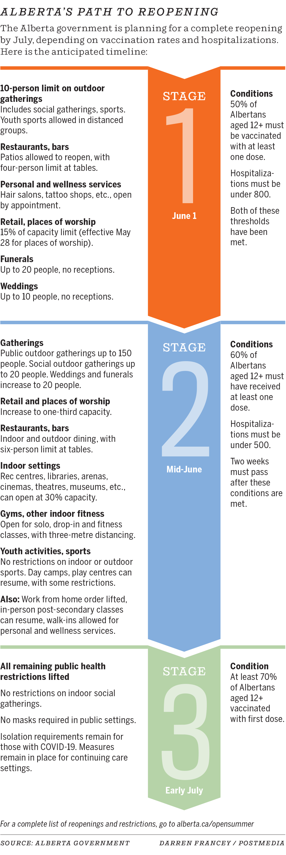 The province is scheduled to enter Stage 2 of the government’s reopening strategy on Thursday, so long as hospitalizations remain below 500 and declining. The step would see fewer restrictions for most industries, outdoor gatherings, outdoor sports, public gatherings and weddings.