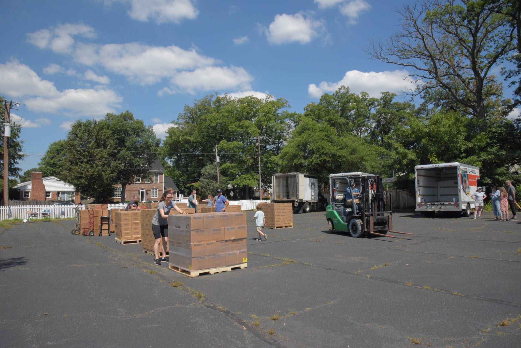 The 40,000 pounds of food were forklifted off the truck, and divided and distributed between 5 different local food banks: Casa Chirilagua, Grace Episcopal Church, Our Lady Queen of Peace Roman Catholic Church, Rising Hope Mission Church, several Arlington Schools, and the Church of Jesus Christ of Latter-day Saints.