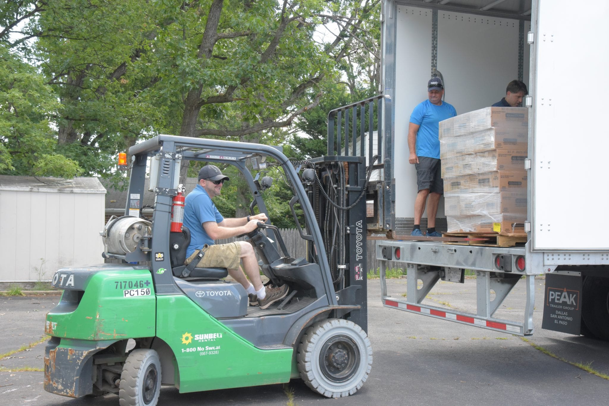 The hero of a forklift driver, Geoff Nichols, who drove all the way from Fredericksburg at 5:30 in the morning, unloaded numerous of palettes from the semi-truck.